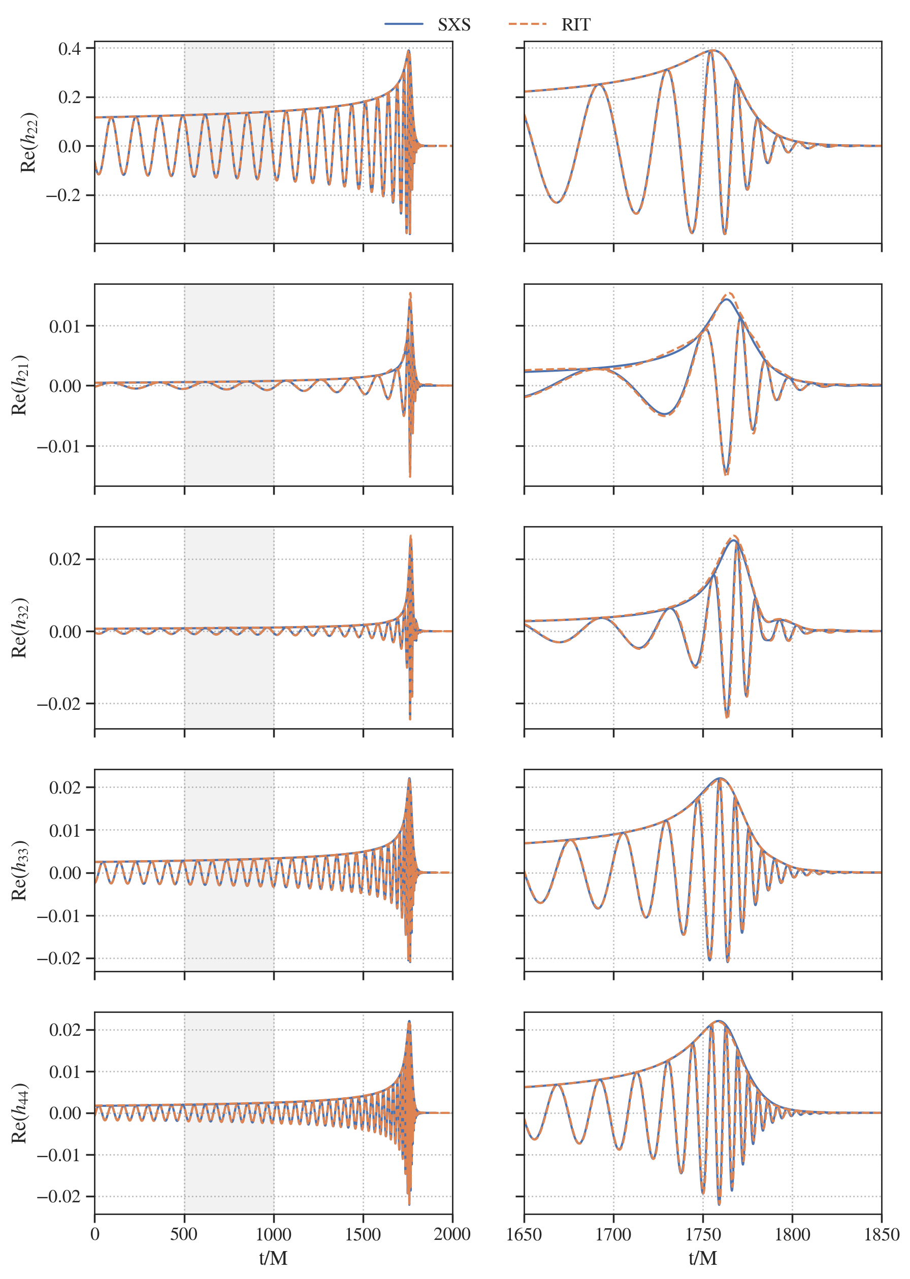 ax[j, col].plot(wf_rit.u, np.real(h_lm_shifted), label='RIT', color='C1', linestyle='--')